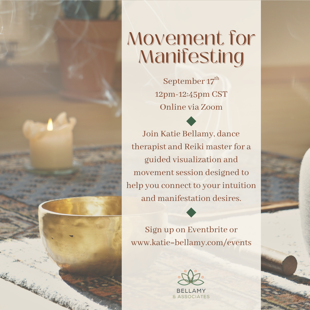 Events Join us for for one of our upcoming events. Sign up for Autumn Affirmations Sign up for Book Talk Sign up for our newsletter and be the first to know about our next event. First Name Last Name Email Address I'm in! I’ll never share your information. Thank you for joining my newsletter.I look forward to connecting with you! Ongoing Events Reiki Level I Book Now Reiki Level II Book Now Past Events Join for an in-person Level 1 Reiki training Katie will be a presenter at this Chicago retreat April 22-24th, 2022 see more Navigating Now: Everyday Wellness Practices for the Workplace with Thoughtium | November 2021 Watch Now Predicting the Flow of Collegiate Recovery with Sober Voices | September-October 2021 See More Reiki Level 2 Training | May 2021 See More Reiki Level 1 Training | November 2020 See More Moving Through It: Movement & Journaling Sessions | October 2020 See More Navigating Now: Breathwork & Resilience with Thoughtium | June 2020 Watch Now Somatic Training for Therapists | February 2020 See More Speaking on “The Mind-Body-Spirit Connection" at Chicago WAAT | August 2019 See More Summer Somatic Release Featuring Myofascial Release | July 2019 See More Creative Recovery Group, Chicago Mindful Psychotherapy | Spring 2019 See More Satiate the 'I Deserve its!' | September 2018 See More Q&A Video on Rationalizing Unhealthy Food Choices | August 2018 Watch Now Satiate Your "F**k Its!” | June 2018 See More